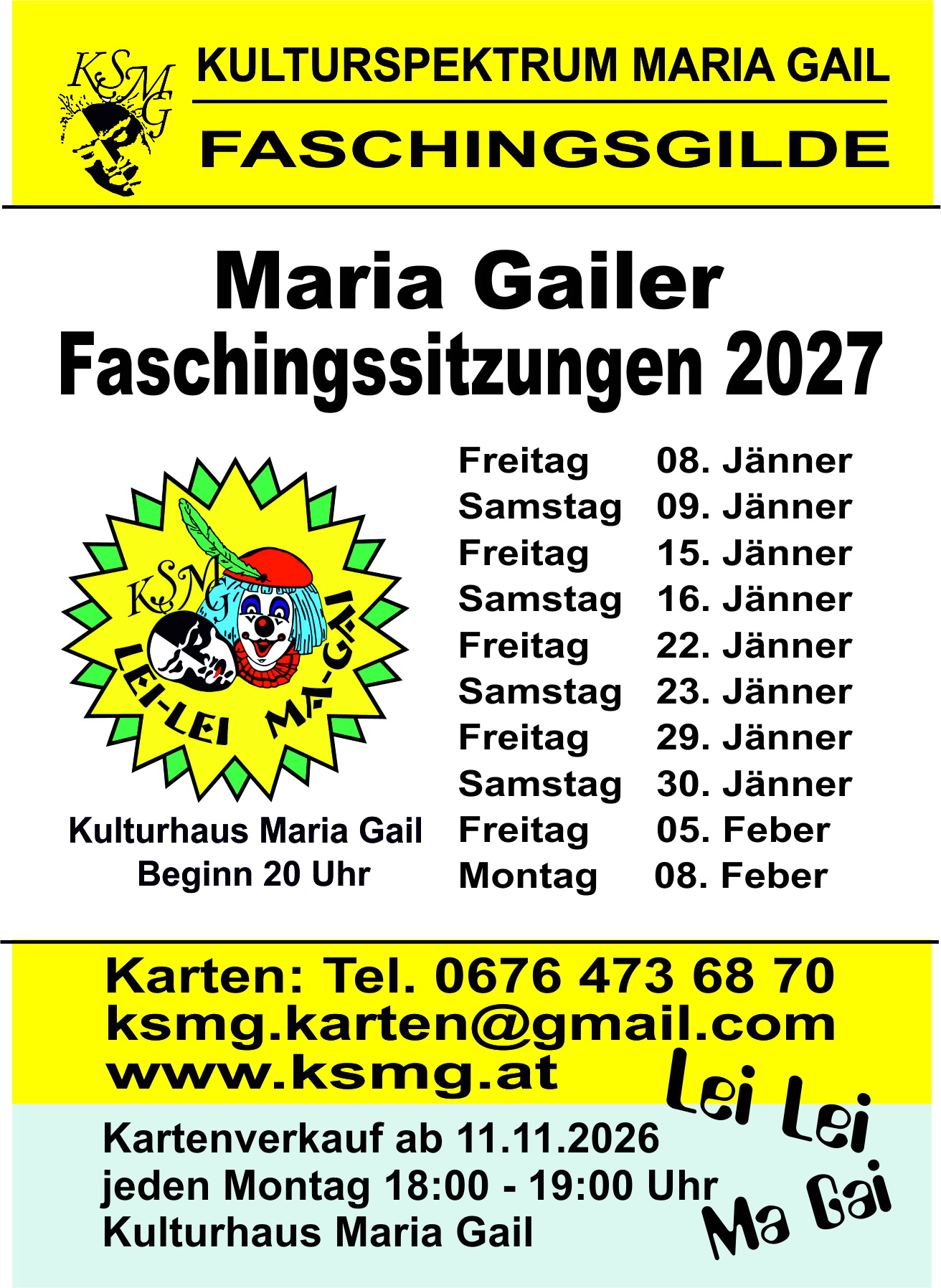 Die Maria Gailer Faschingssitzungen sind seit vielen Jahren ein Fixpunkt im Programm des Kulturspektrums Maria Gail, im Jahr 2023 feiern wir bereits 40 Jahre Maria Gailer Fasching!
